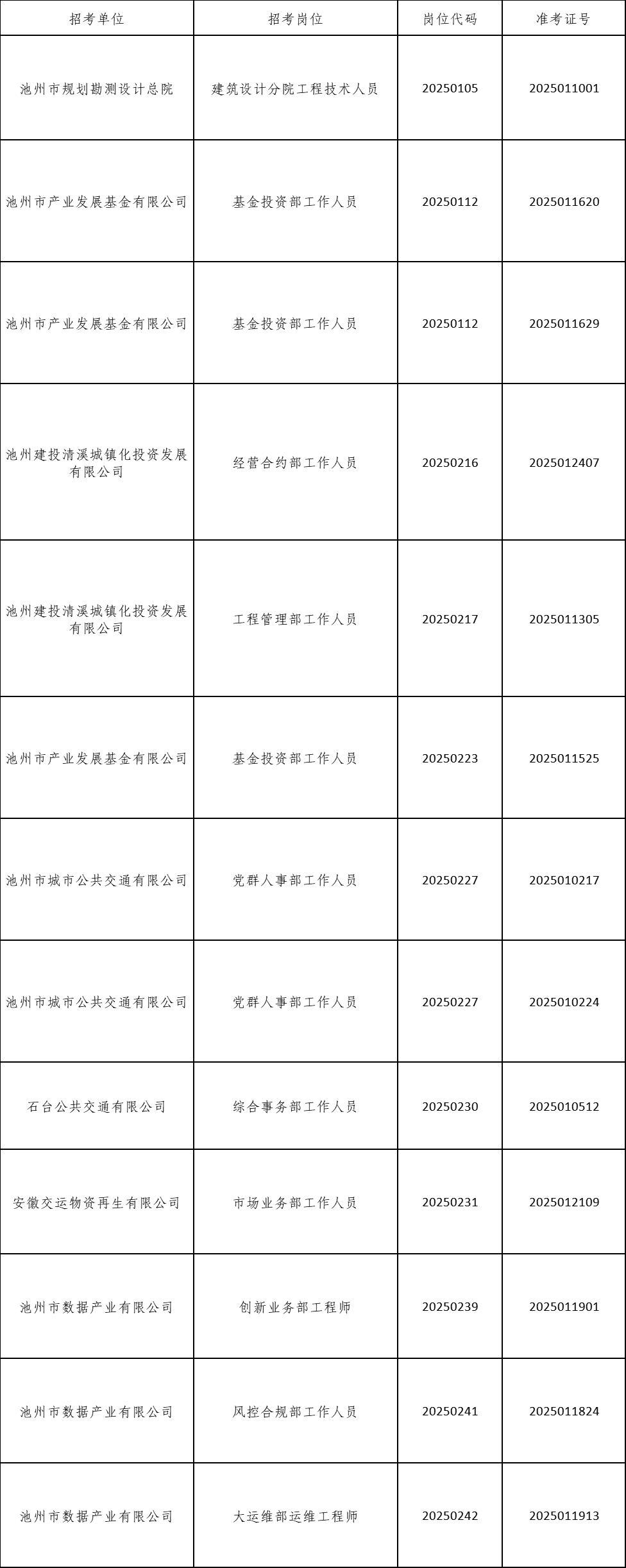 根據(jù)《池州市投資控股集團2025年公開招聘工作人員公告》要求,由于入圍現(xiàn)場資格復審的考生中有部分人員自動放棄或不合格產(chǎn)生了人員空缺,現(xiàn)按《公告》要求,在報考同崗位的考生中按筆試成績從高分到低分的順序依次遞補,成績出現(xiàn)并列者一并進入資格復審,現(xiàn)將入圍遞補資格復審情況公告如下: