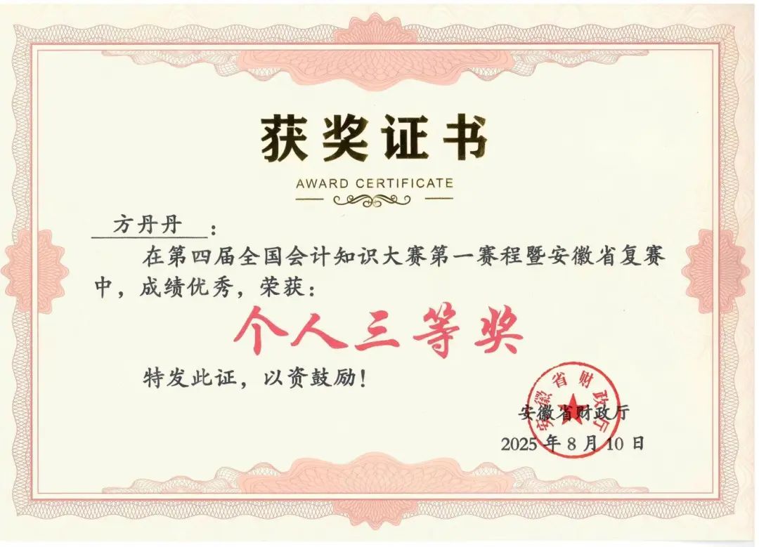 近日,第四屆全國(guó)會(huì)計(jì)知識(shí)大賽第一賽程暨安徽省復(fù)賽在合肥圓滿(mǎn)落幕。在與全省440名會(huì)計(jì)英才比拼對(duì)決中,集團(tuán)所屬財(cái)務(wù)管理公司方丹丹憑借扎實(shí)的專(zhuān)業(yè)知識(shí)和出色的發(fā)揮,榮獲個(gè)人三等獎(jiǎng)。