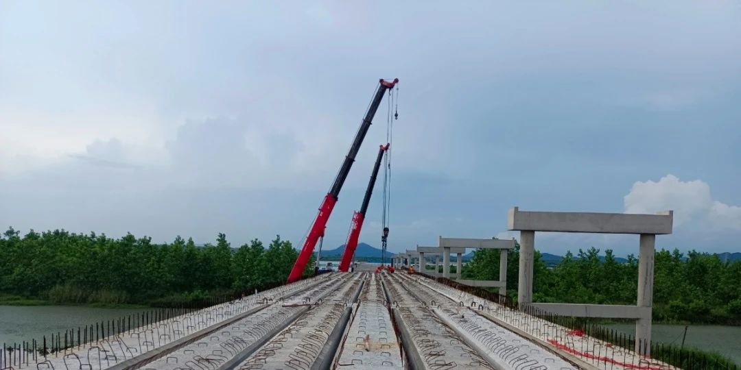 引橋空心板吊裝工程屬于超危大工程,本次空心板共計231塊,單塊空心板最大重量約30t,最大長度達(dá)到20m,為確保吊裝工作順利進(jìn)行,前期完成了引橋預(yù)制空心板吊裝專項方案專家論證,通過對汽車吊等輔助工具的選擇及起重進(jìn)行精準(zhǔn)計算決定采用雙臺起重機(jī)配合吊裝的非常規(guī)起重方法,隨后,資運(yùn)集團(tuán)組織參建方對運(yùn)輸進(jìn)場道路進(jìn)行了加固,組織吊裝單位對現(xiàn)場進(jìn)行勘察,吊裝區(qū)域地基基礎(chǔ)處理等工作,以及吊裝前對相關(guān)人員進(jìn)行了技術(shù)交底和安全教育。在吊裝現(xiàn)場,工作人員密切配合,準(zhǔn)確的溝通和緊密的協(xié)調(diào),嚴(yán)格執(zhí)行吊裝方案,規(guī)范操作吊裝設(shè)備,順利完成了首次吊裝任務(wù),為后續(xù)安全高效吊裝積累寶貴經(jīng)驗。