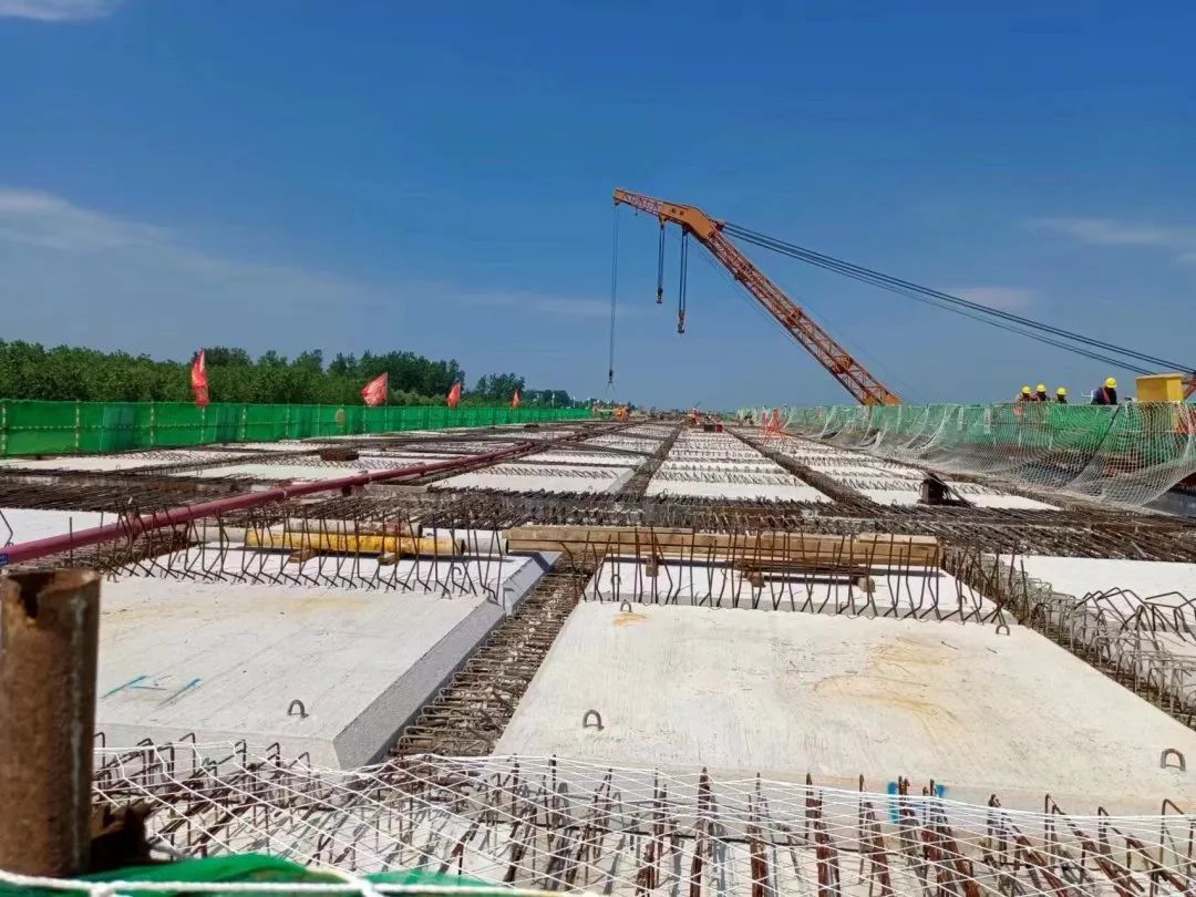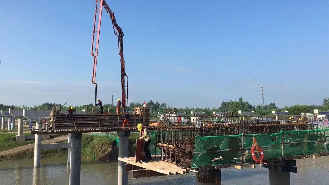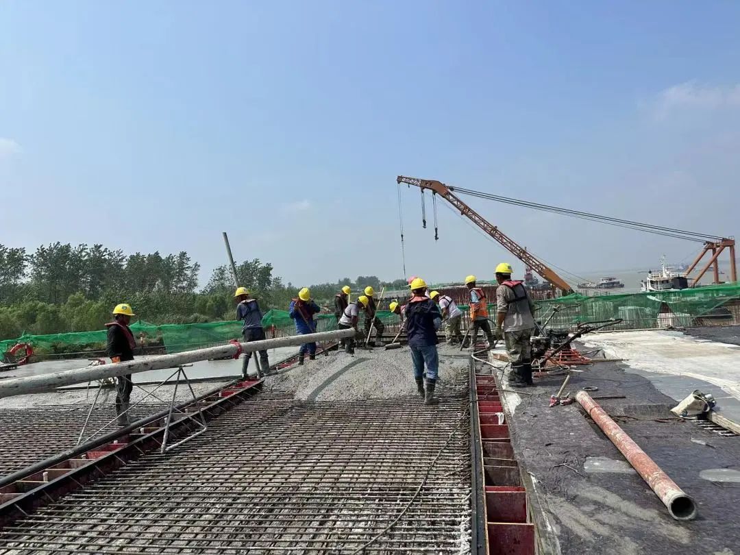 前期工作已完成,PHC管樁及鋼管樁已施工完成,引橋灌注樁施工124根,完成總量的97%,下橫梁施工完成,預制梁安裝完成84%,預制板安裝完成70%,上橫梁施工完成61%,現(xiàn)澆面層完成7%,水下拋石完成41%。